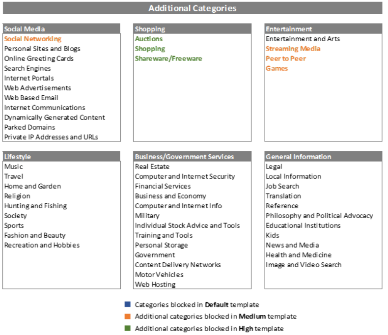 The Default TPx Webroot Secure DNS protection template blocks three categories of sites by default: “Security Risk”, “Human Resources”, and “Questionable and Legal”. Customers can also choose to place users into one of two Additional protection templates – Medium and High, to further enhance protection and policy enforcement. A group for “Uncategorized” sites exists, which will block anything new to the web that hasn’t been categorized by Webroot yet as harmful or otherwise. All users receive this protection by default. A detailed category list is provided below.
