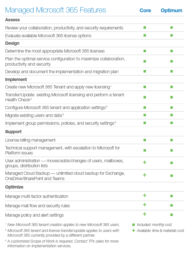 - Microsoft 365 OPTIMUM: The OPTIMUM Service level is designed for organizations that want TPx to manage and administer their Microsoft 365 environment. It includes all features of the CORE service level, as well as User Account Management, Configuration Management and Security Administration. In addition, OPTIMUM Service includes a Disaster Recovery solution for Microsoft 365 to protect Email, OneDrive, SharePoint and Teams data against loss.