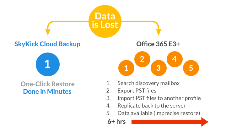 Microsoft 365 OPTIMUM Service Level includes a comprehensive Backup solution that protects Email, OneDrive, SharePoint, Groups, and Teams data against loss. This solution is provided to TPx through best-in-class software from Skykick. Skykick Cloud Backup empowers your customers to get the most out of their Microsoft 365 investment by protecting their data and productivity across the Microsoft 365 tenant. Microsoft 365 it is not designed to quickly and easily restore lost, deleted, or corrupted data to ensure ongoing productivity. It is designed to protect against an infrastructure failure, not a loss of Customer data. Considering that 75% of Cloud Data loss is due to human causes (Mistakes, Malicious attacks, etc), this leaves a major gap in Microsoft’s Disaster Recovery story that puts Customer’s data at risk. Without Skykick Cloud Backup, a single restore request can mean several hours of downtime – if the data is even recoverable (as seen in the chart below).