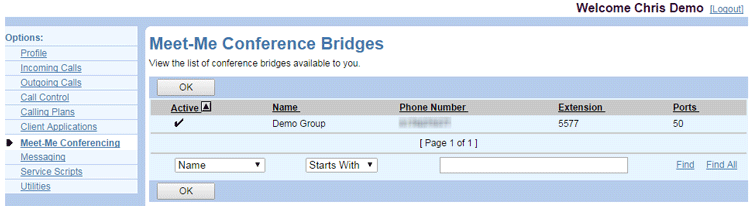 - The Meet-Me Conferencing Bridges page displays a read-only list of all the bridges for which you have host privileges. This page shows both active and inactive bridges.
