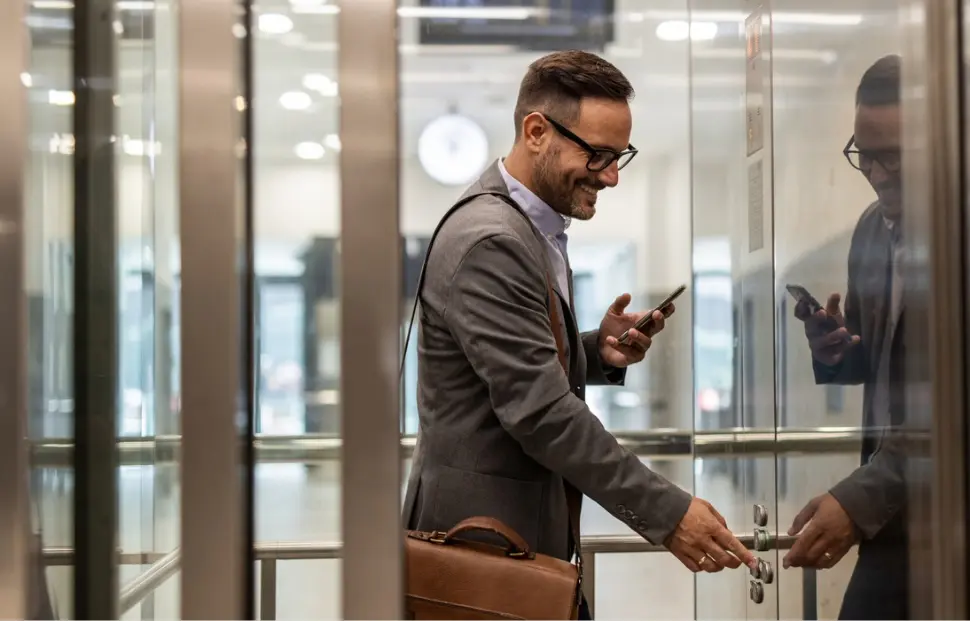 A businessman in a suit smiles while entering an elevator, holding his phone and pressing a button.